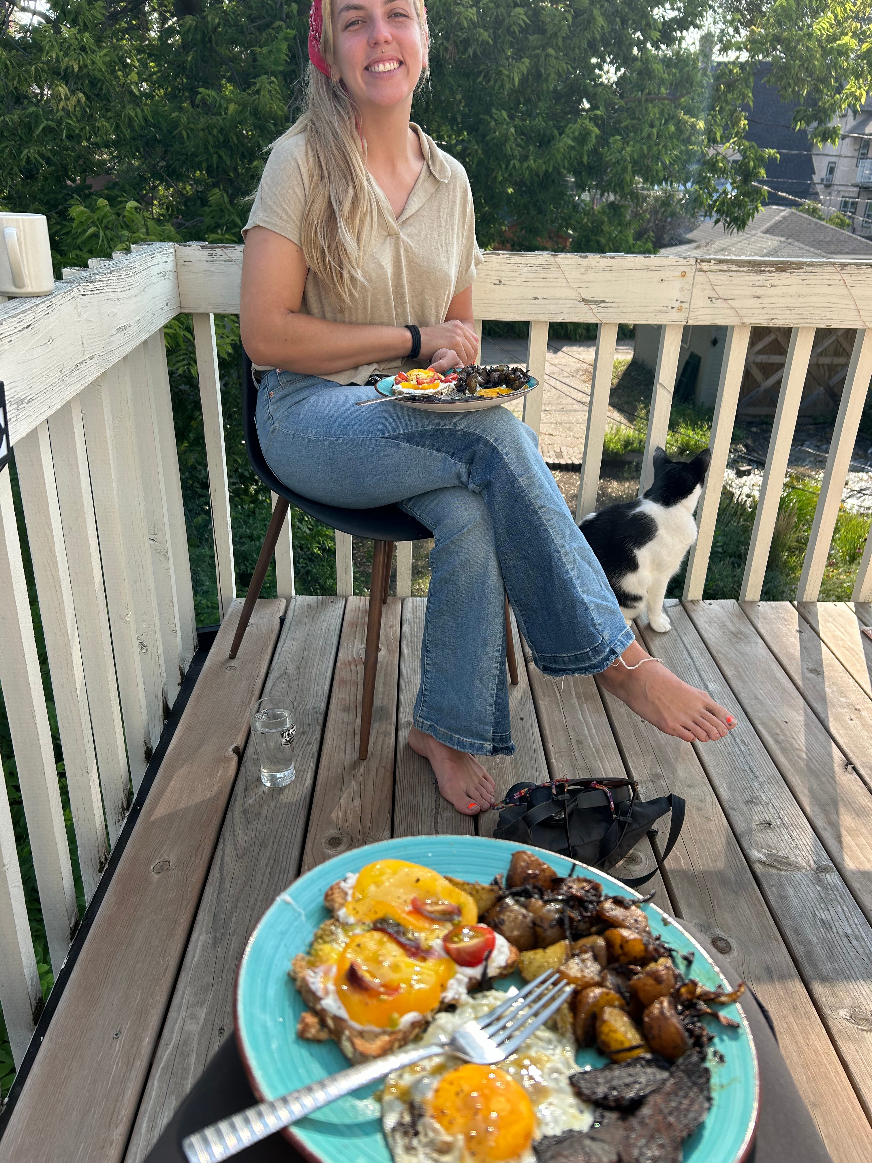 At my last apartment in the city, I was lucky enough to have a deck, one of the more perfect places to share nourishment. There, I whipped up pre-country dancing dinners for sweeties, impromptu sourdough pancakes for early riser, farm dreamer pals, pre house show potlucks full of farm fresh veggies & corner store candy & co-op loaves of sourdough nibbled atop every towel & blanket I could scrounge up. As the sun shone across the park, we devoured duck fat saturated morels with our bare hands, passed around homemade kombucha & banana bread & beamed through mouthfuls of buttermilk ice cream & plum preserves. Oh, the beaming — it almost never stopped.